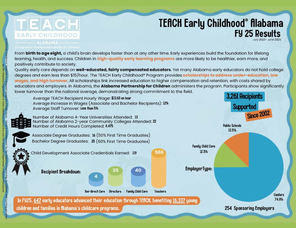 TEACH Early Childhood® Alabama is a licensed program of Early Years, and is a program of the Alabama Partnership for Children. TEACH is funded by the Alabama Department of Human Resources and the Alabama Department of Early Childhood Education.